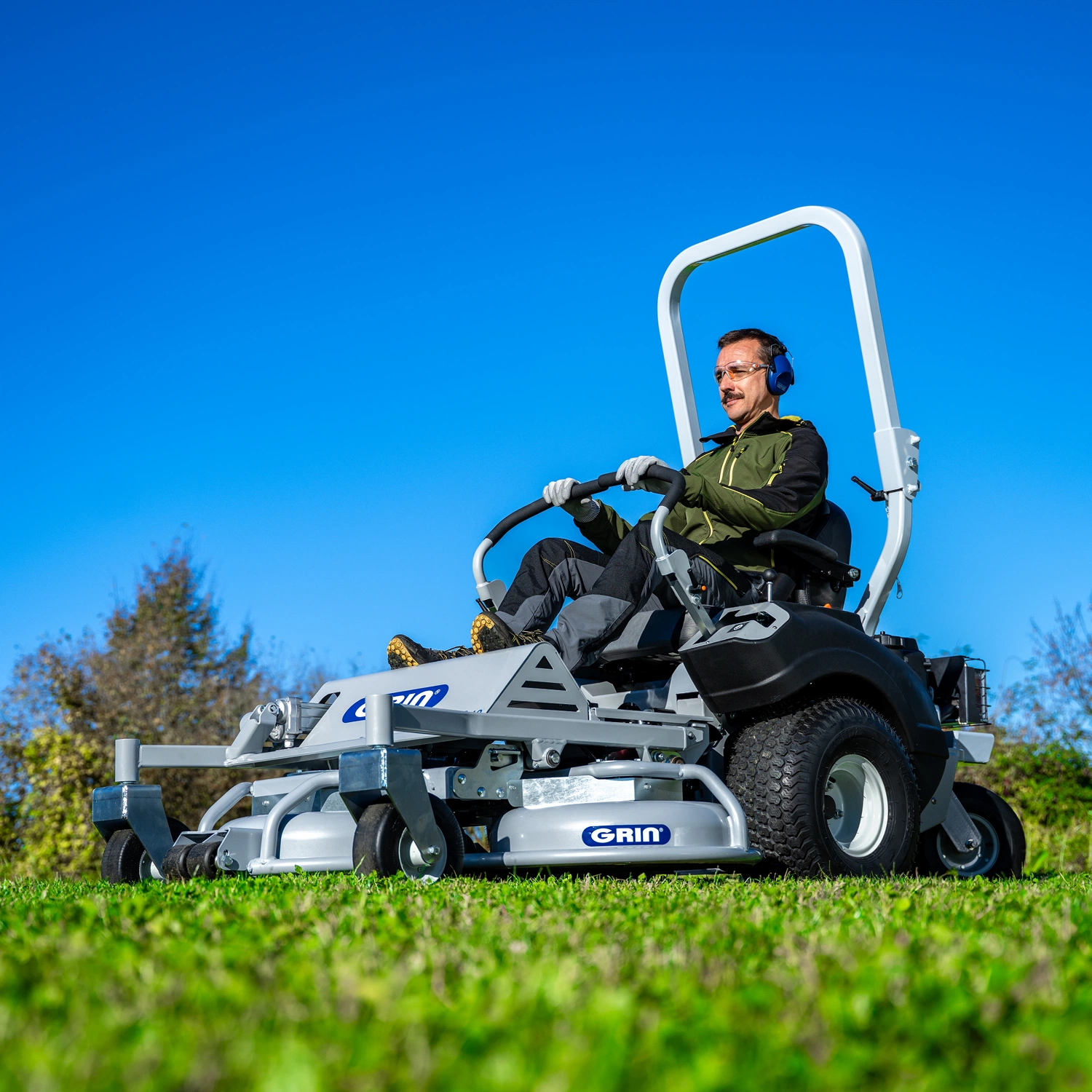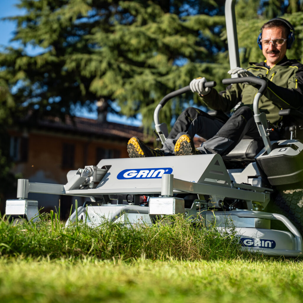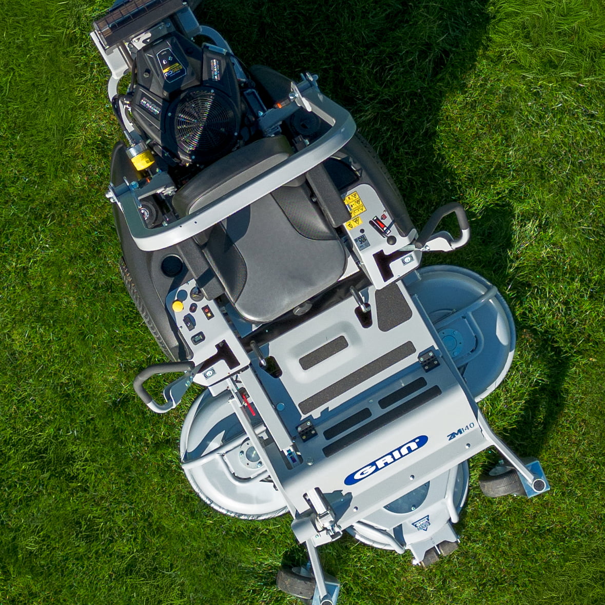 GRIN ZM est une tondeuse autoportée avec plateau frontal dédié à l’entretien des grandes espaces verts.